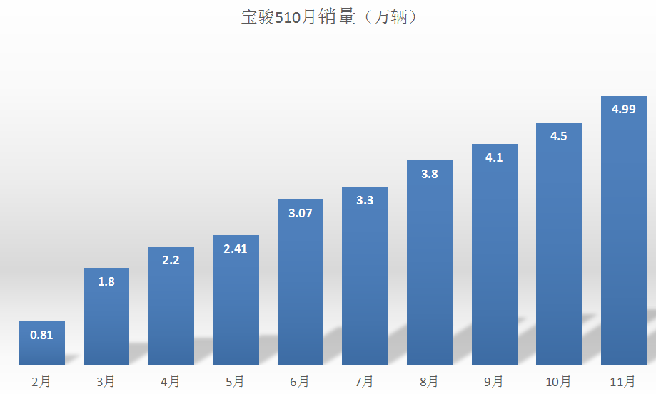 这是一个十分恐怖的成绩,要知道丰田威驰入华15年,累计销量也不过80万辆而已;不过比这个销量更加恐怖的则是510的销量增长速度,2月20日晚宝骏510正式上市,仅有手动挡车型的510上市8天销量就已经超过了8000辆,3月份510的销量达到了1.8万辆,6月份510的月销量突破3万辆,9月510加入了自动挡车型之后,销量达到4.1万辆,在刚过去的11月,510的销量达到了4.99万辆,依照这样的速度增长下去,12月哈弗H6的大佬地位就不保了!