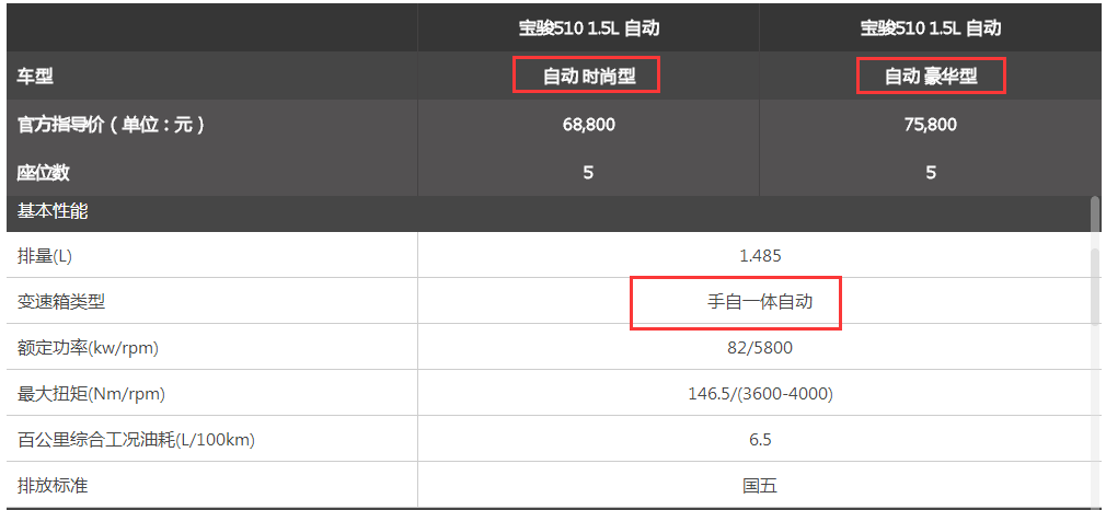 相比较号称智能手动挡的宝骏560 AMT车型不同,这一次510自动挡车型在车型配置名称上叫做“1.5L自动时尚型”“1.5L自动豪华型”,而在官网的配置表里变速箱类型一栏也清楚地写着“手自一体自动”,好吧,连几个挡位都不写了?看来坦白承认自己是5挡AMT变速箱的560 AMT车型销量遇冷之后,宝骏也开始玩文字游戏了,普通消费者咋一看还真以为510这次使用了传统的AT变速箱,不过其实510自动挡本质上使用的还是那台5速AMT变速箱。和560的智能手动没区别。