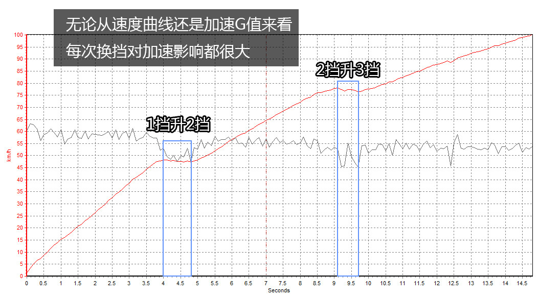 但是开上510 AMT之后虎哥的感觉还是不错的,换挡时间相比较560和730的AMT车型明显有所缩短,而且在1挡的时候发动机还挺有劲的,起步的一瞬间加速G值能够达到0.595g,不过升入2挡之后最大G值仅有0.302g,加速感明显降低,最终宝骏510自动挡三挡破百,用时14.76秒,我知道你们看到这个破百成绩肯定要开骂,这么慢的加速还说动力感觉可以?