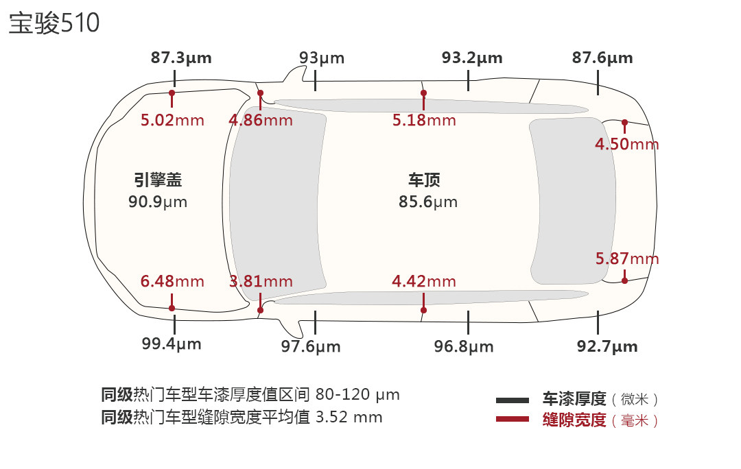俗话说有长必有短,510的短处就在于钣金缝隙水准了,从测量数据来看510的钣金缝隙偏大,而且缝隙还不算均匀,尤其是前舱盖的缝隙较宽,有一些影响观感,这对于自称“颜兽”的510来说有些拖后腿呀。