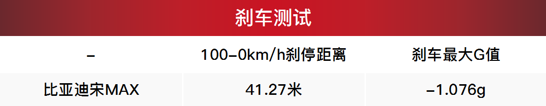 而宋MAX另一个问题则在于刹车表现上,从实测刹车数据上来看宋MAX的刹车表现还是不错的,41.27米的制动距离对于一款MPV来说比较优秀,而且制动过程中宋MAX的车身十分平稳,ABS工作时刹车踏板也没有弹脚感,全力制动的表现足够好,然而对于日常使用来说虎哥想给宋MAX的刹车表现给一个差评,首先就在于刹车初段偏软,需要将踏板踩得足够深才能有足够的制动力,然而刹车踏板的脚感又比较硬,因此在日常驾驶中给人感觉就是:“我明明踩得很重了,怎么还是刹不住车?”,日常使用体验并不怎么好。
