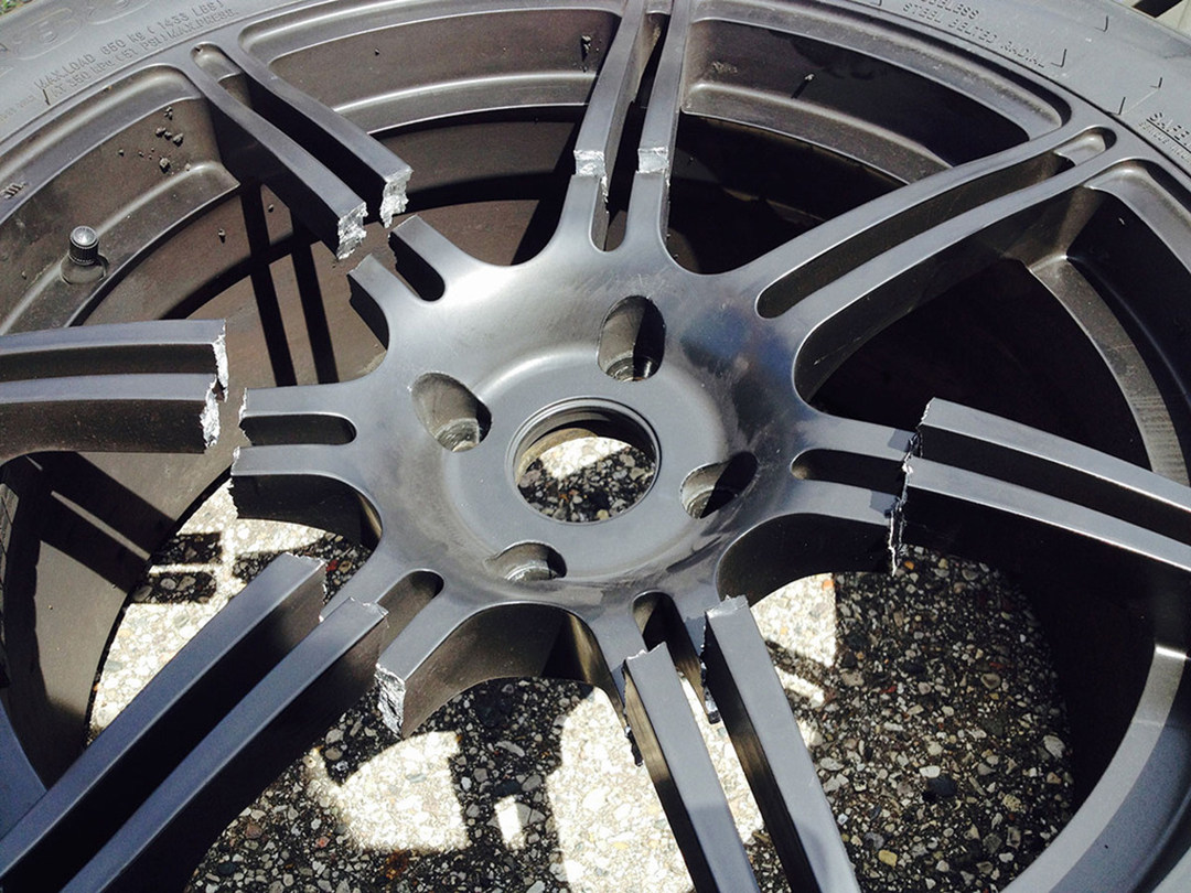 一条质量可靠的正厂锻造或者铸造轮圈,即使遇到紧急的撞击,也能够保持一定的完整度,这是为了降低爆圈爆胎时产生的安全风险。像图中的AMG原厂锻造铝圈,即使爆了一部分,整体依然能保持完整。
