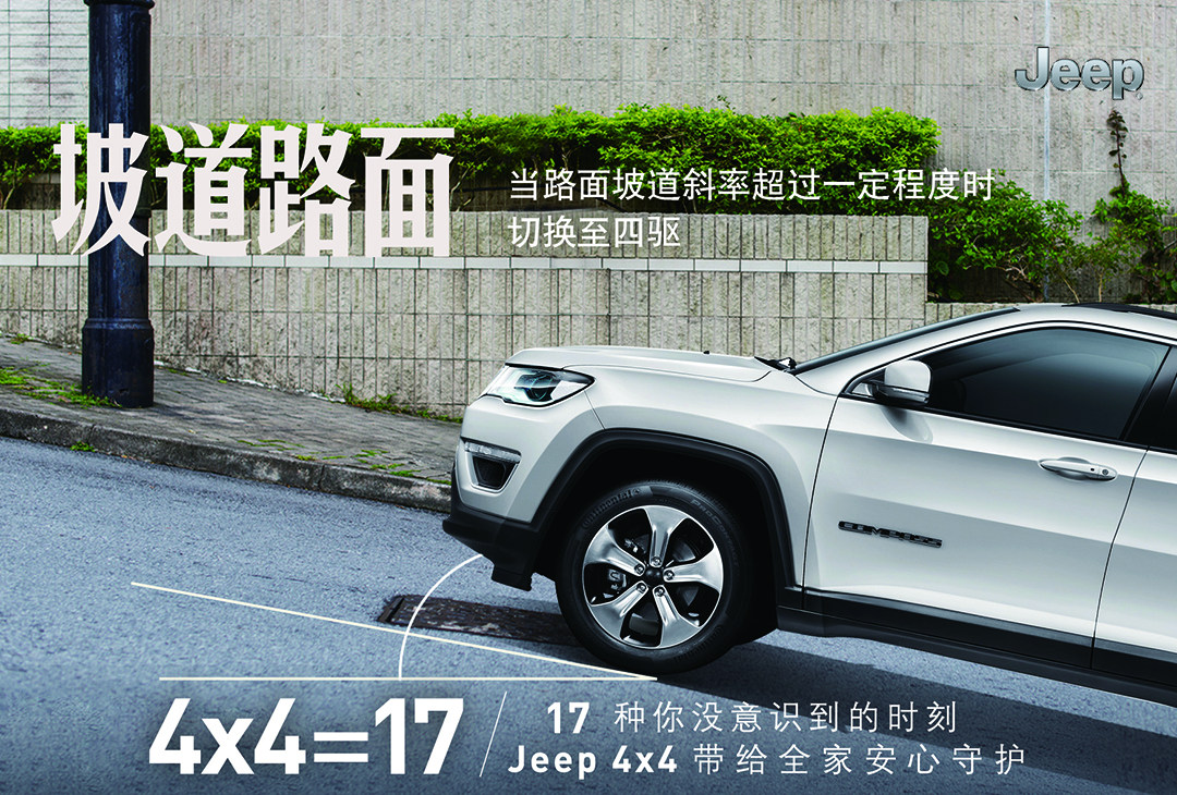 都知道4X4=16;但等于17的数字从何而来?Jeep为指南者设定了17种情况可在auto模式下瞬间从两驱形式切换至四驱模式;这其中包括低速起步、雨雪路况、路面坡度倾斜达到一定程度(斜率小于10%便可触发)、低温气候、甚至紧急变线等等;基本上涵盖了日常行车中常见的行驶状况,在最需要的时候便可以最稳妥的方式将车身稳定在安全状态。