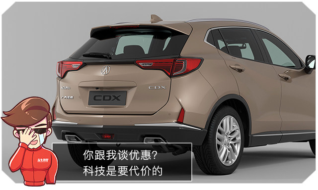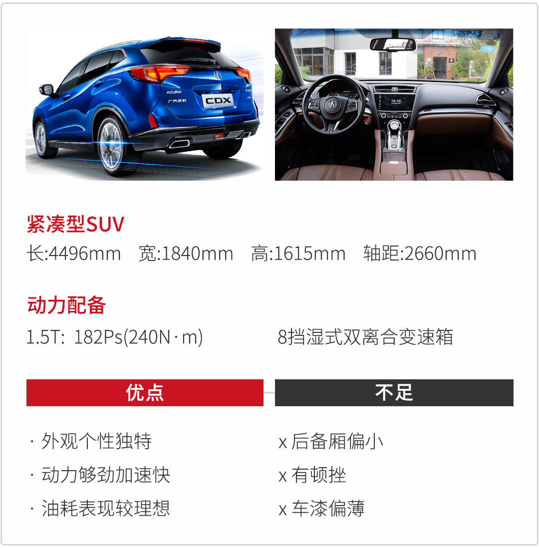 其次是动力性能和科技配置,CDX仅有1.5T动力,最大马力182匹,百公里加速可达8秒多,性能算是不错的了,配置方面全系标配无钥匙启动/进入、拨片换挡、主动降噪、LED远近光灯等配置,中配以上有HUD抬头显示等,可以说比较厚道,低配入手也是够用的。