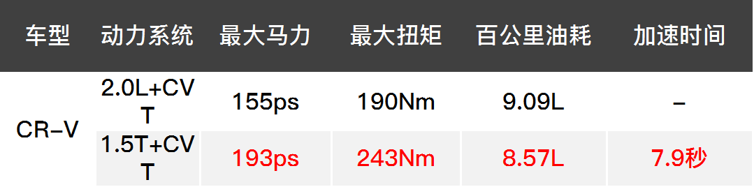 上一代CR-V使用了2.0L发动机,小熊油耗上2.0L+CVT的上一代CR-V油耗为9.09升/100公里;新一代CR-V在整备质量上与老款相差无几,并且也使用了CVT变速箱,但是换装了1.5T发动机,使用了新发动机的CR-V最大功率提升了38马力/53牛米,动力上新CR-V 1.5T已经逼近老款2.4L的输出水平,实测百公里加速7.9秒(老款的2.4L都要9.47秒),动力大幅提升之后的CR-V 1.5T车主油耗为8.57升/100公里,相比老款的2.0L还降低了0.52升/100公里。