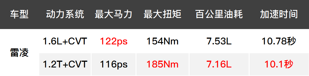 相比较1.6L车型,雷凌的1.2T发动机功率虽然降低了8马力,但是扭矩却增加了31牛米,达到了1.8L自然吸气的水平,从实测加速来看,1.6L车型实测百公里加速为10.78秒;而1.2T车型仅仅需要10.1秒,动力的提升也是显而易见的。