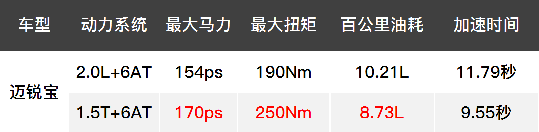 相比2.0L发动机,迈锐宝1.5T的动力提升非常大,实测1.5T车型的百公里加速为9.55秒,而2.0L车型则需要11.79秒,加速成绩提升了2秒多。