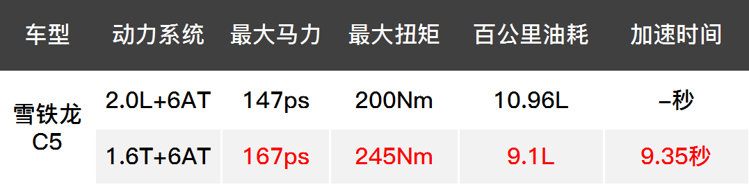 和迈锐宝一样,雪铁龙C5 2.0L也是背负了一个高油耗+跑不动的骂名,10.96升/100公里的车主油耗确实吓人,然而换装了1.6T发动机之后C5的油耗降低到了9.1升/100公里;而且动力上也是提升巨大,C5 1.6T车型的实测百公里加速为9.35秒,要知道老款C5 2.3L的百公里加速都需要10.3秒,动力提升可谓巨大。