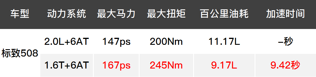 换了1.6T发动机之后,508的车主油耗降低了整整2升,508的1.6T车型实测加速也仅需9.42秒,相比较老款车型提升还是很大的。