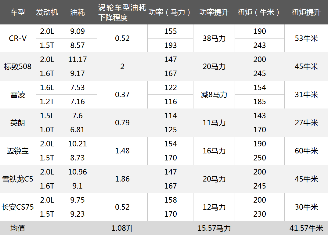 综合来看,这些车在换了涡轮增压发动机之后,平均节油1.08升/100公里,动力平均提升了15马力/41牛米之多,加速的提升也显而易见,价格相同的情况下,小排量涡轮增压车型显然在动力和油耗上都更有优势。