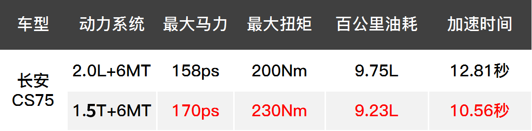 最后说说自主车,虽然自主车的涡轮车型相比合资车型还是有差距,但是相比自吸车型也是提升巨大,长安CS75从2.0L换成1.5T发动机之后油耗降低了0.52升/100公里,虽然油耗下降不是很明显,但是加速提升却是非常大的,CS75的2.0L手动车型实测百公里加速为12.81秒,而1.5T手动车型仅需10.56秒,加速提升了整整2秒多!