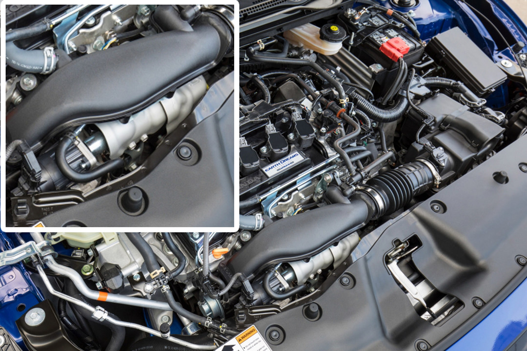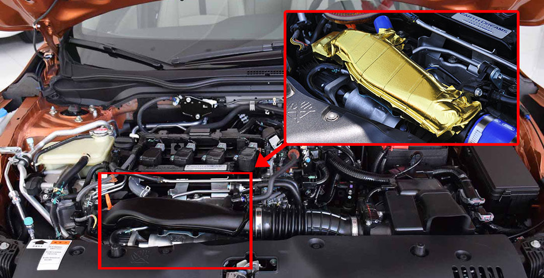 首先,看到思域发动机舱的你一定会注意到,思域220TURBO系列车型搭载的1.5T发动机的进气管路就在发动机涡轮增压器上方经过,而高速运转时不断产生高温的涡轮增压器和进气管路本是水火不容的物体。在思域身上,分隔它俩的就只有一块薄薄的隔热片,如果发动机全力工作,小小的隔热片将无法阻挡涡轮增压器的高温对进气管内空气温度的影响,导致进气过热,发动机功率下降。