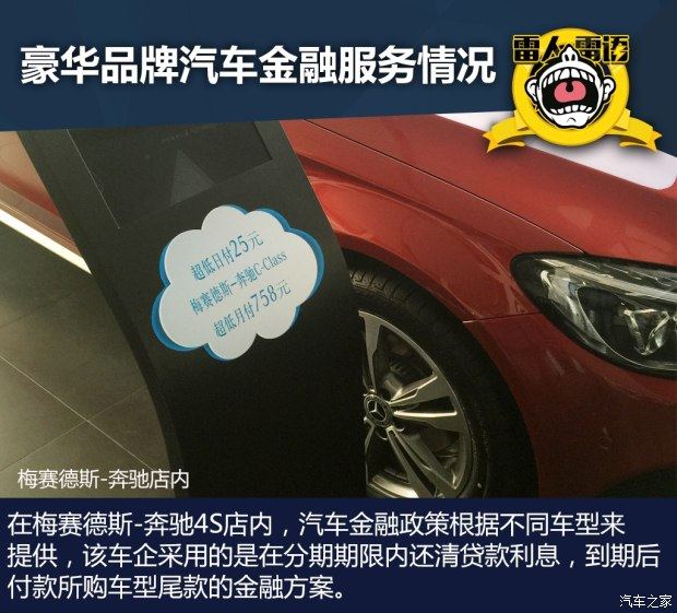 这里值得一提的是,捷豹路虎和梅赛德斯-奔驰的金融方案也十分有吸引力,店内的金融政策已经按车型的不同将月供甚至日供费用标列出来。例如奔驰C级,在贷款购车模式下首付只有6.2万元,月付为758元。需要说明的是,梅赛德斯-奔驰的金融政策是在分期期限内将贷款利息还清,到期后需要将购买车型的尾款付清,这种方式对于短期内有资金压力的消费者十分受用。