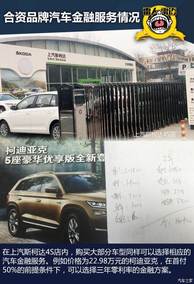 合资品牌方面,雷哥走访了上汽斯柯达4S店,店内同样提供汽车金融服务。当被问及指导价为22.98万元的柯迪亚克2018款TSI330 7座两驱豪华优享版的贷款政策时,销售人员回答当下有两万元的现金优惠,然后在首付50%之后,可以选择三年零利率的金融服务,分期服务费用为3500元。