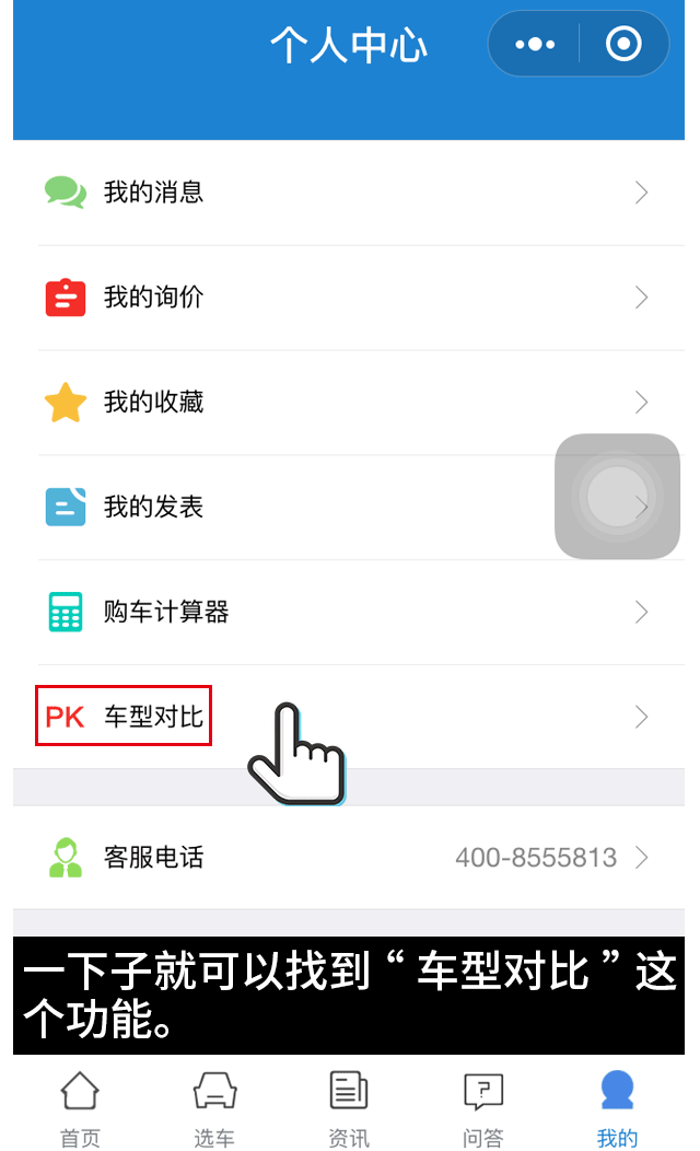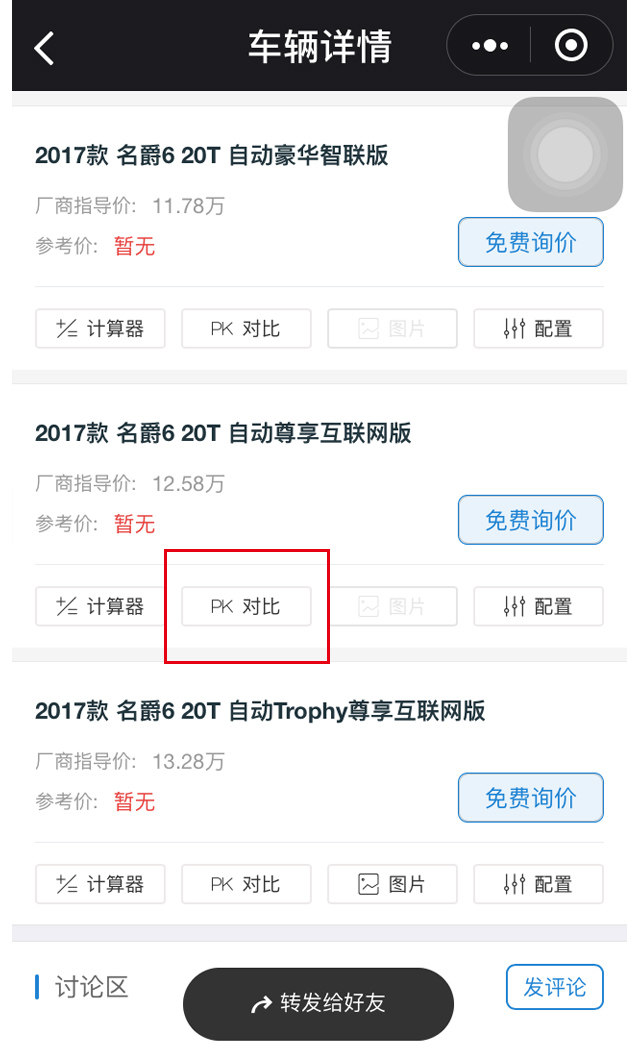 另外,车型对比这个功能在车辆详情页也可快速找到,每个车型下方都带有“PK 对比”菜单,方便浏览车型时快速进入车型PK页面。