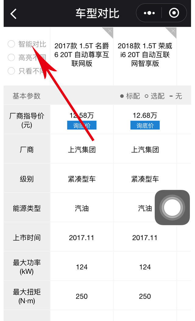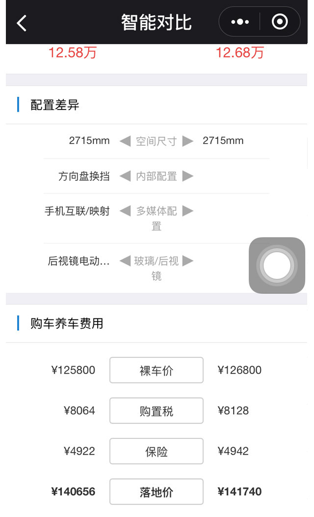 “智能对比”可以显示一些主要的项目、购车费用等。比如下图: