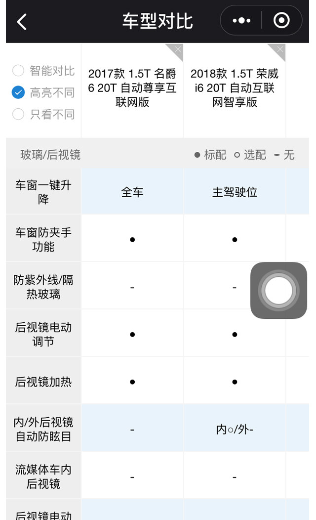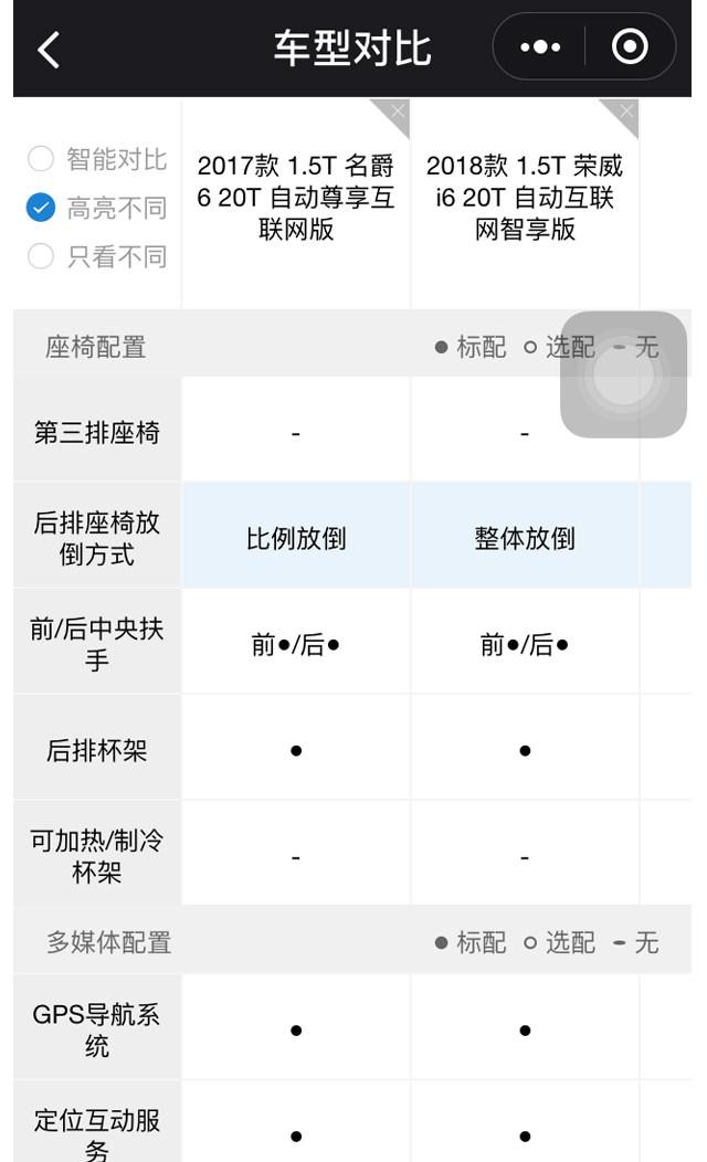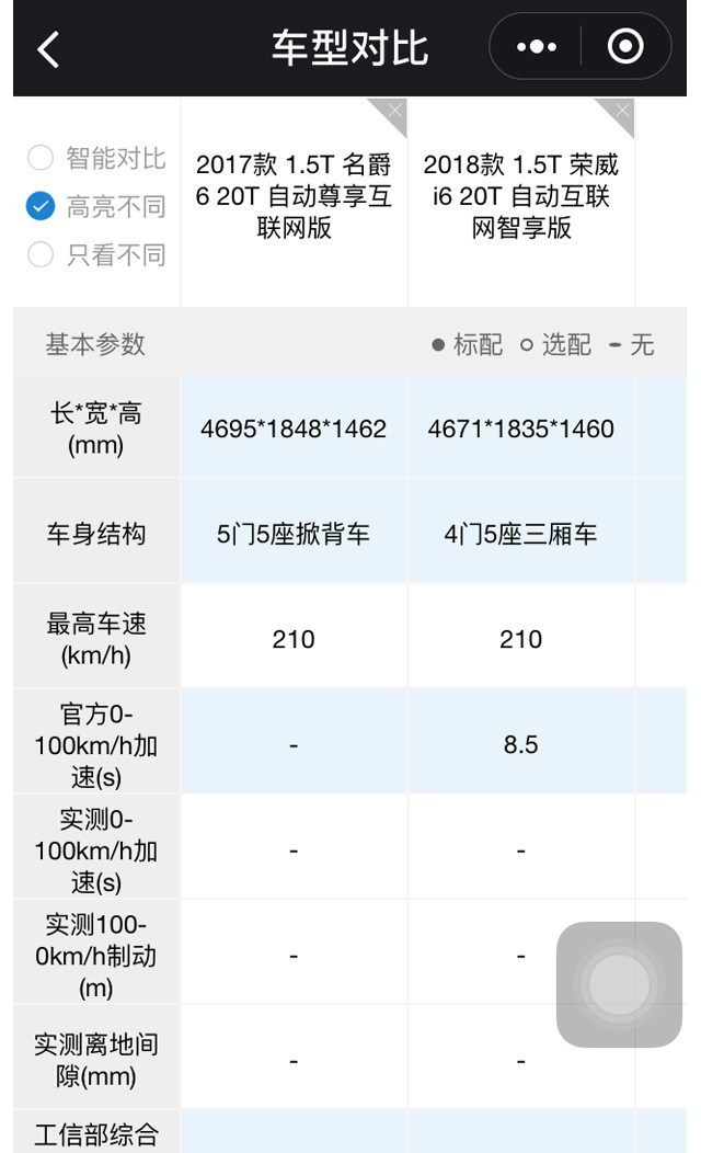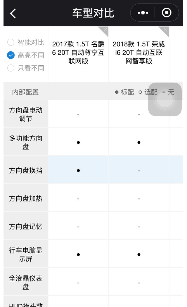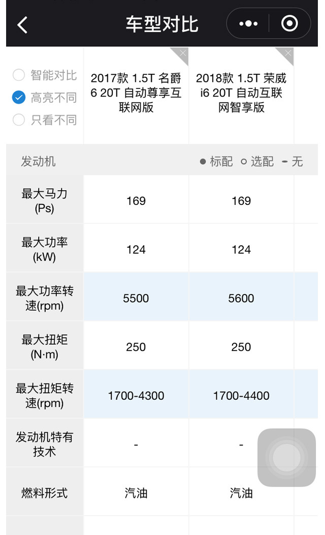重回到车型对比页面,隔壁老王开始对每项配置进行详细的对比。