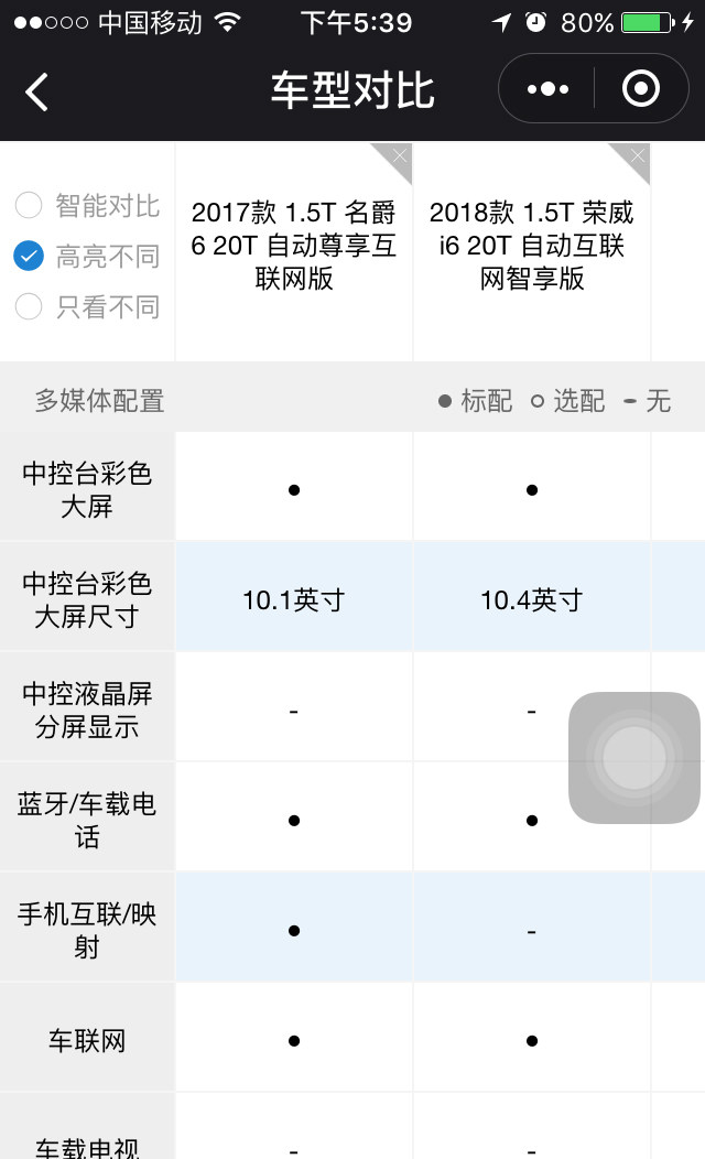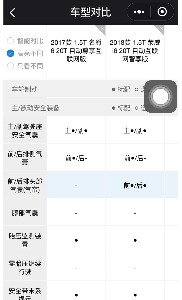 “高亮不同”可以以特定的颜色显示两款车配置有哪些不同。