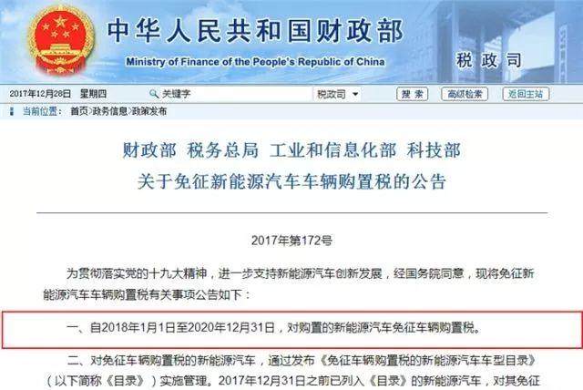 2017年12月27日,财政部、税务总局、工业和信息化部以及科技部联合发布关于免征新能源汽车车辆购置税的公告,公告称,自2018年1月1日至2020年12月31日,对购置的新能源汽车免征车辆购置税。