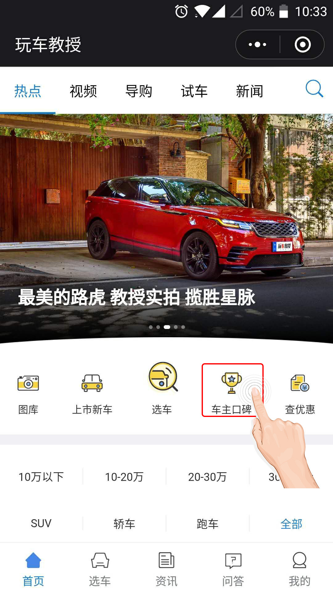 来到玩车教授小程序首页,车主口碑还是挺显眼的,杯子形状的这个就是,难道用用杯子的icon是谐音寓意吗?口杯?口碑?有点意思。