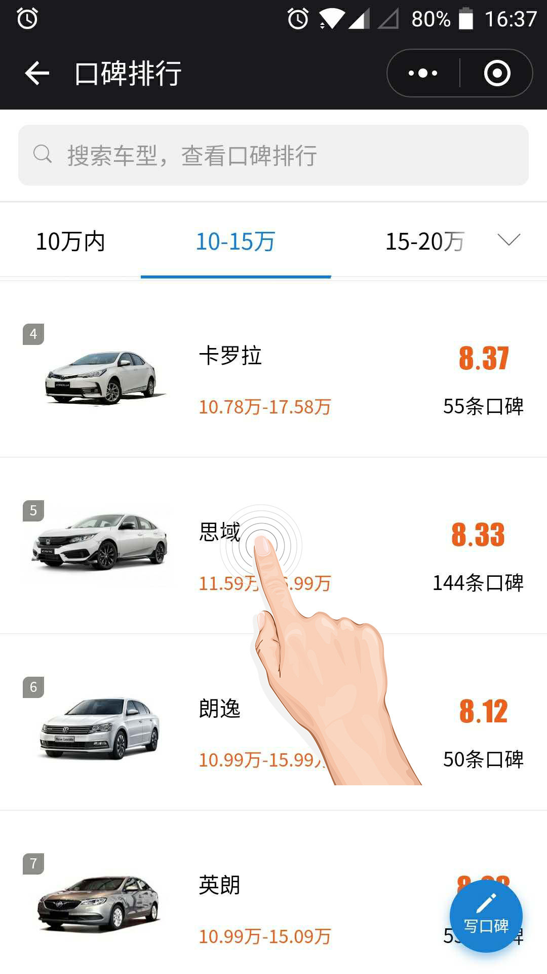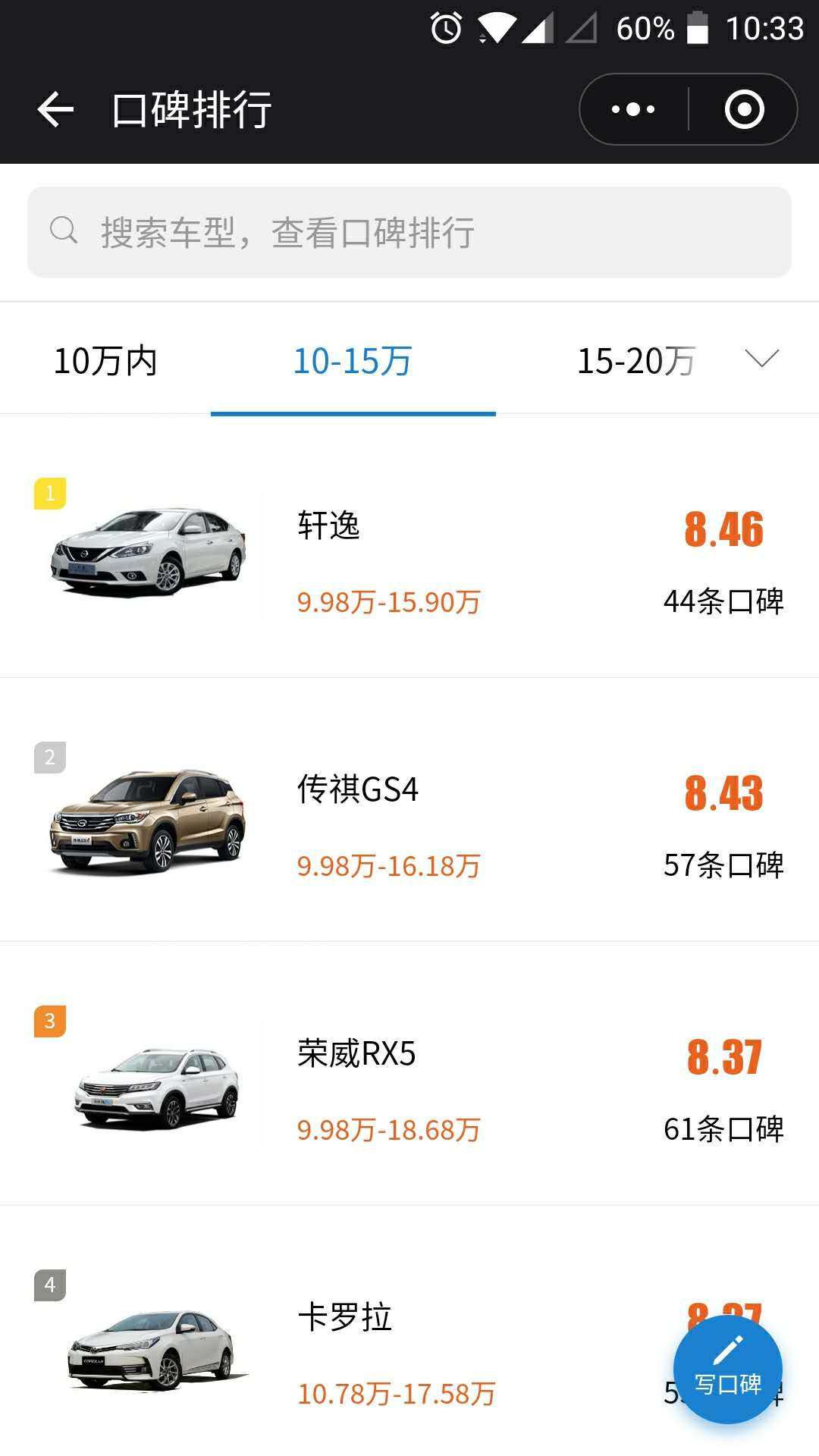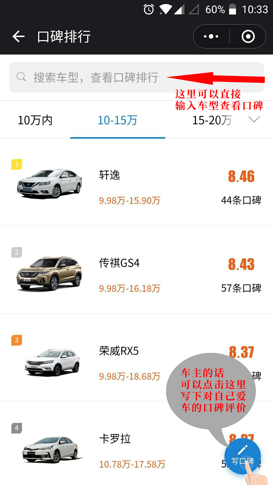 再次来到熟悉的口碑页面,要是懒得去价格区间找自己想看的车,可以在上方的搜索框直接输入车名搜索。已经是车主的小伙伴,也可以点击写口碑,来写下自己对自己爱车的评价,帮助下其他有购车想法的车友,比如我。哈哈。
