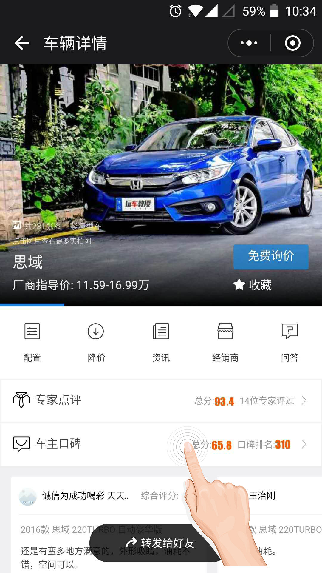 我还是喜欢思域多点,继续找找思域口碑。往下滑动一下,就看到思域了,排在第五位,看来评价也还是可以的。点击下,就会看到进入到思域的一个车辆详情页面,车主口碑就在中间。