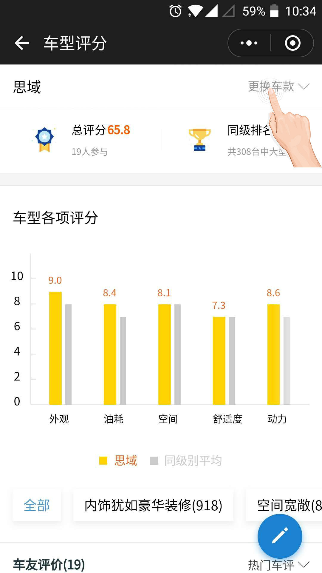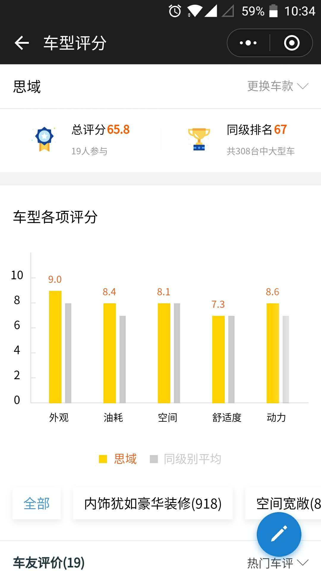 继续点击车主口碑,首先看到的是一个竖状图,这个是用来直观的表现这个车型五个项目的综合评分的,黄色柱就是思域的分数,灰色柱是同级别平均分数。思域在外观和动力方面都远超同级别啊,赞,我就想要外观帅,动力强的车子。