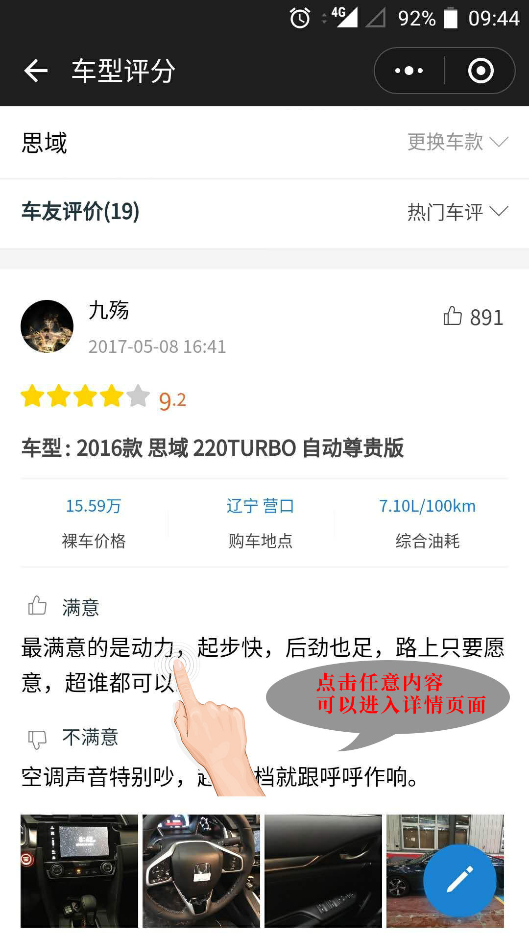 再往下滑动,就能看到来自车友对自己爱车的评价了,这位九殇大哥的口碑有891个赞,来看东西,肯定得留下点什么,鄙人先赞为敬。这个页面只能看到一点内容,要想看具体的评价,还得再点击下文字内容,进入九殇大哥的详细评价页面。