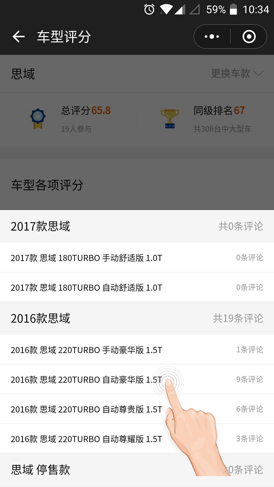 如果想看具体车型,比如我比较想买1.5T 自动豪华版,可以在思域车主口碑的初始页面,点击右上角的更换车款,再点自己想看的车型就OK了。