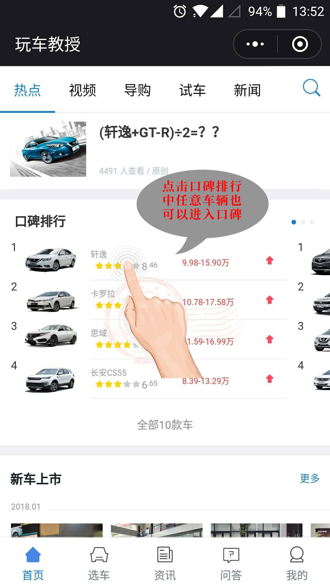 玩转了一下玩车教授小程序,发现车主口碑还有另外一个入口。就在首页中间位置的口碑排行,随便点一辆车就能进去。