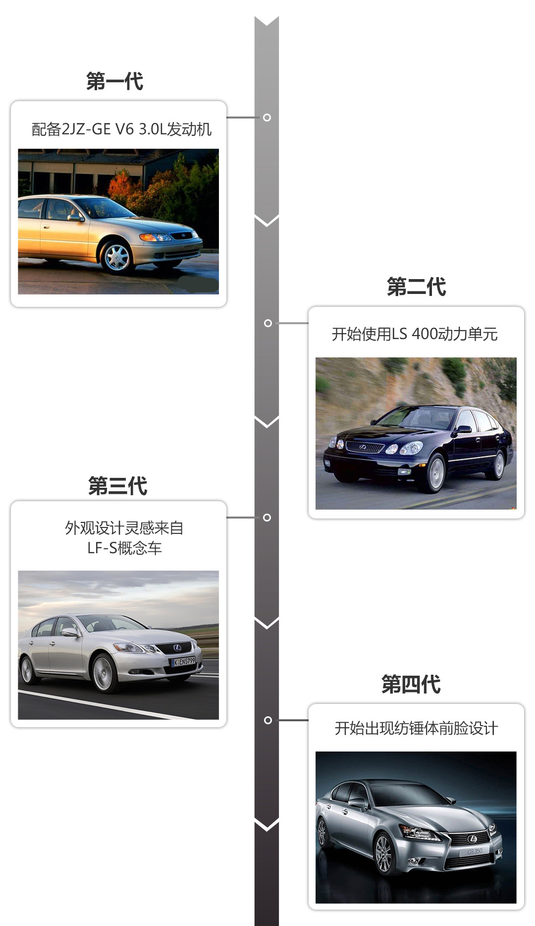 1989年,雷克萨斯登陆美国那时,只拥有ES和LS两款车型,分别是属于紧凑型和中大型,家族里急缺一台中型车的存在,为了更快地抢占当时的美国中型车市场,在两年后,在日本市场发售的丰田Aristo改头换脸变成了美国市场的车系——GS。