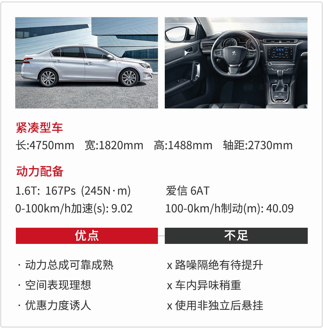 点评:前脸沉稳大气、车身线条简约干练,整车稍显朴实,一改法国佬的浪漫调性。内饰用料实在、做工严谨,只是简洁中控台找不到几个物理按键,不利于行驶中盲操。PSA 1.6THP发动机与第三代爱信6AT的组合,动力平顺度表现令人满意。408综合实力较均衡,只是较高的售价、国人不太待见的后扭力梁悬挂设计,令其销量与前面两位对手相差甚远。
