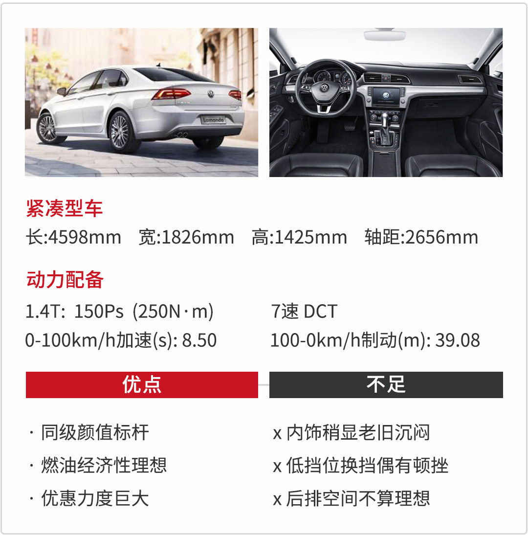 点评:大灯、进气格栅相连呈现俊秀的前脸,辅以低矮和较宽的车身,轿跑味油然而生。受大众简约设计理念影响,内饰造型设计稍显传统沉闷。1.4T EA211发动机搭配DQ200 7速双离合变速箱,低速小顿挫难免,但加速超车仍游刃有余。得益于品牌力号召,凌渡溢价能力稍高,只是这价位使用非电动调节座椅、卤素大灯,有点不厚道。