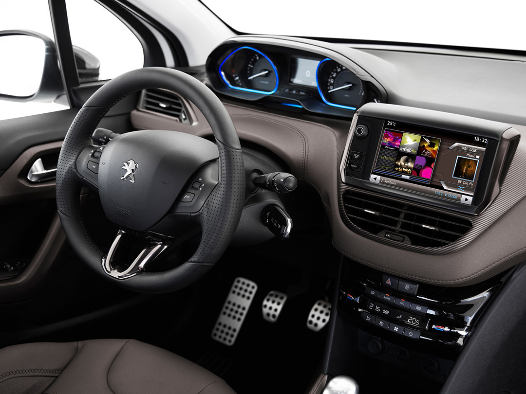 标致2008的内饰设计功能分区非常清晰,立体感十足,轮廓层次非常清晰。内饰中控台较薄以营造更显大的内饰效果,仪表台造型充满了科技感,就连手刹造型也是那么的特立独行。