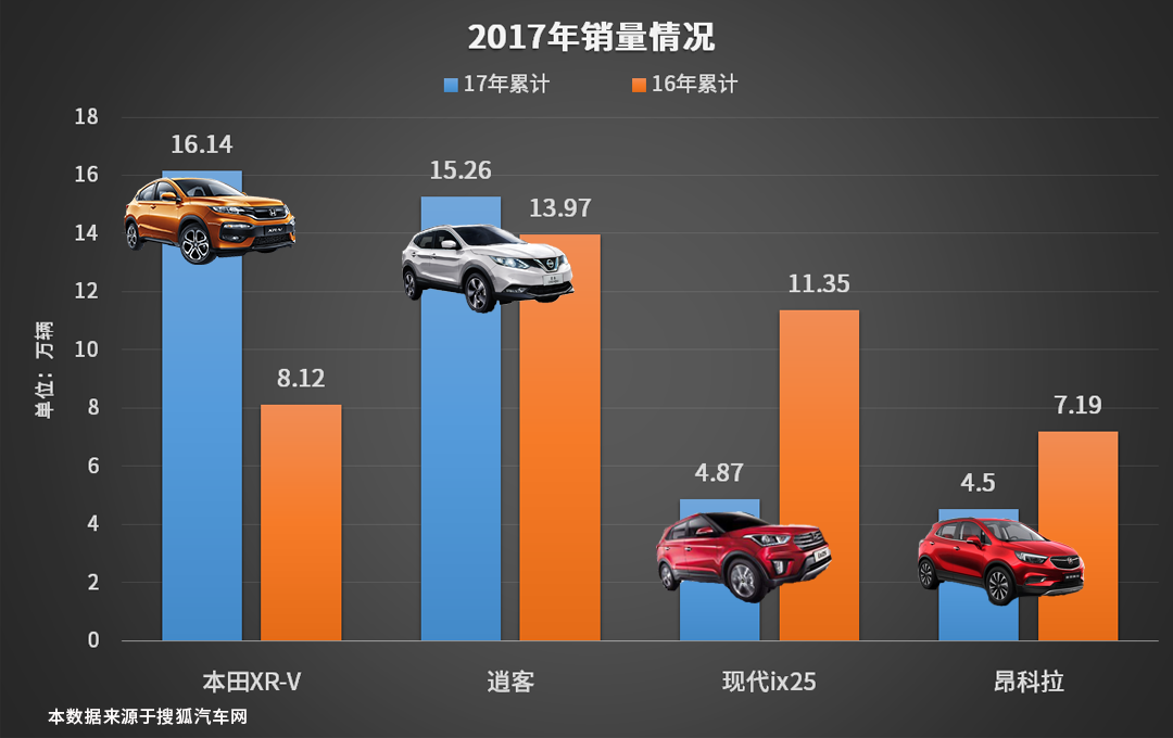 本田XR-V、逍客都是这个价位中炙手可热的车型,而现代ix25在2017年的销量表现比起2016年来说是下滑得严重,昂科拉作为小型SUV中元老级别的存在销量却并不起眼。