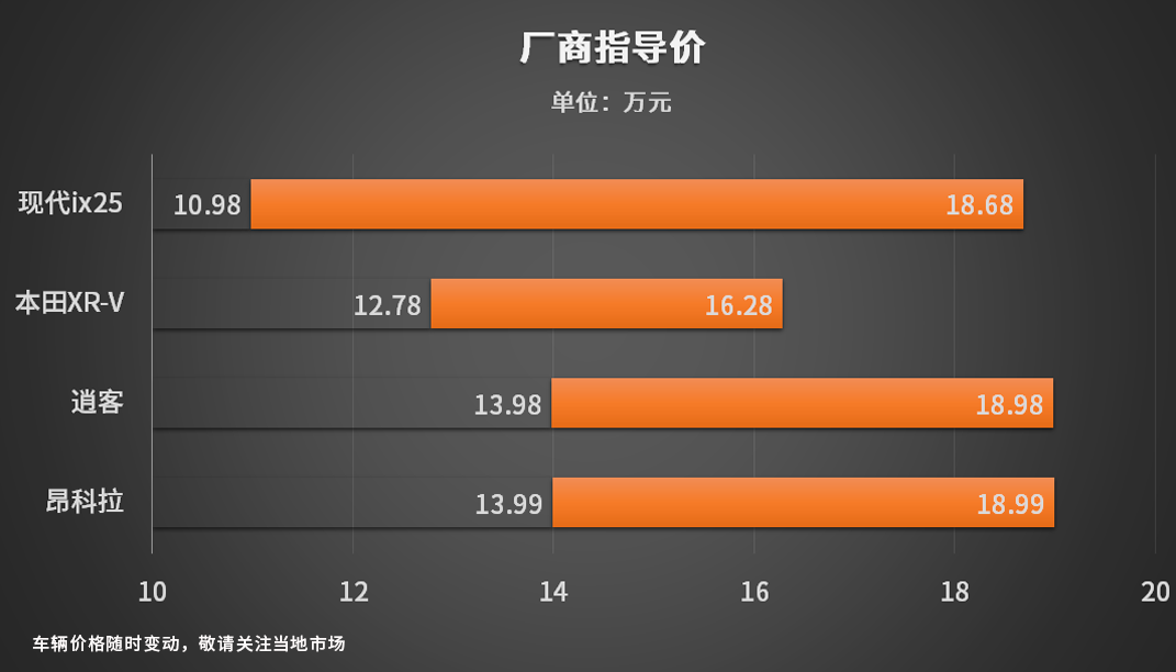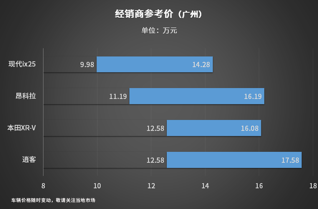 现代ix25是四车中起售价最低的车型,优惠幅度最大的是昂科拉,全系有着2.8万元的现金优惠活动,逍客的平均优惠是1.4万元,而本田XR-V的优惠最小。
