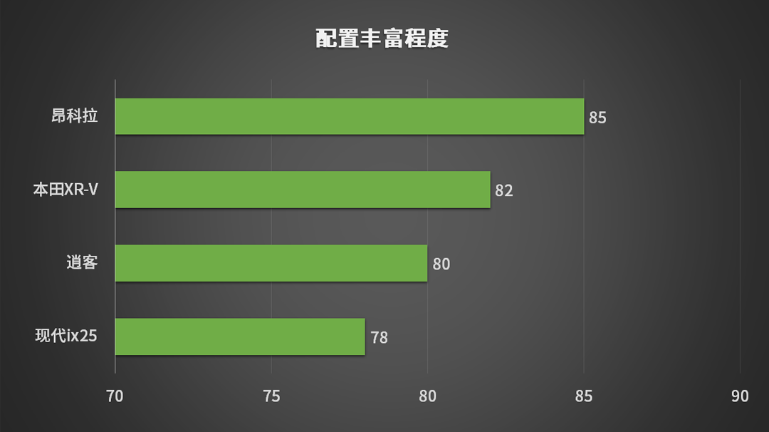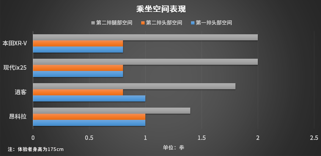 逍客作为一款紧凑型SUV,它的乘坐空间不但在同级别中不占优势,与本田XR-V、现代ix25比起来甚至还要逊色一点,后两者拥有两拳的腿部空间,这样的表现算是十分出色了。昂科拉的头部空间不错,但是腿部空间是四车里面最小的。