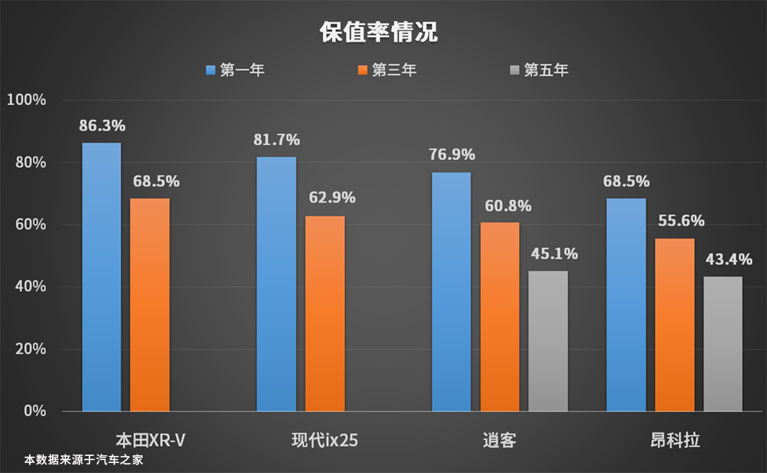 虽然本田XR-V与现代ix25没有第五年的保值率可供参考,但是从前三年的保值情况也可以看出它们在二手车市场中算是较为吃香的,尤其是本田XR-V表现突出,而在保值率这方面昂科拉似乎有点令人失望了。