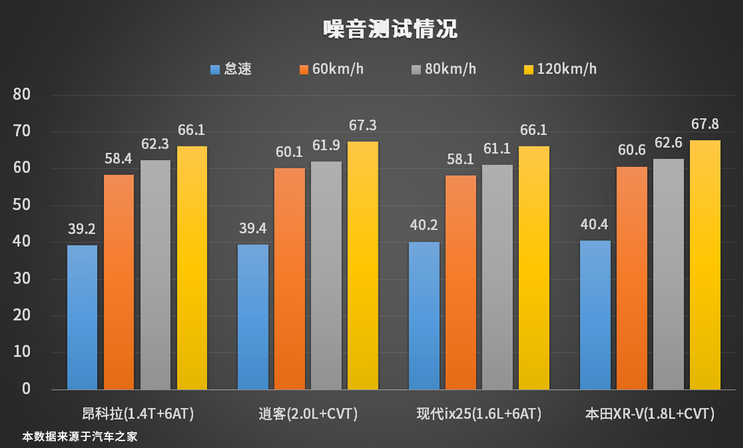 结果不出乎意料,昂科拉在NVH方面的打造是四车中最好的,逍客高速时胎噪偏大,现代ix25的乘坐舒适性处于中等水平,本田XR-V在隔音降噪方面的能力有待提升。