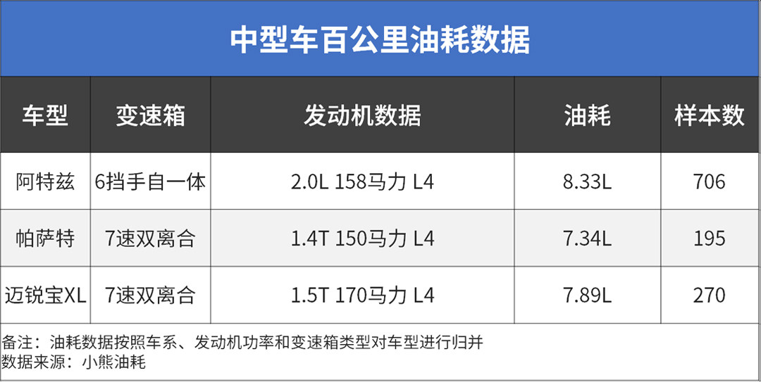 中型车方面,德系的帕萨特油耗表现最佳,美系的迈锐宝xl在动力输出高不少的情况下,油耗表现比起阿特兹还要好上不少。至于热门的凯美瑞和雅阁,油耗表现甚至都比不上阿特兹。其实最大的原因还在于现在德美系都力推小排量涡轮增压发动机,而日系多数中型车依旧是2.0L起步的自吸动力系统,油耗在当下来说已经没啥优势了。