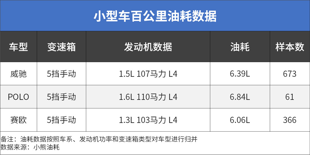 先看看小型车的油耗情况,从车主的实测数据来看,赛欧因排量小油耗较低,Polo的油耗最高,但是Polo的排量和马力也比威驰更大一些,显然虽然威驰油耗也挺优秀但也并非同级最好。