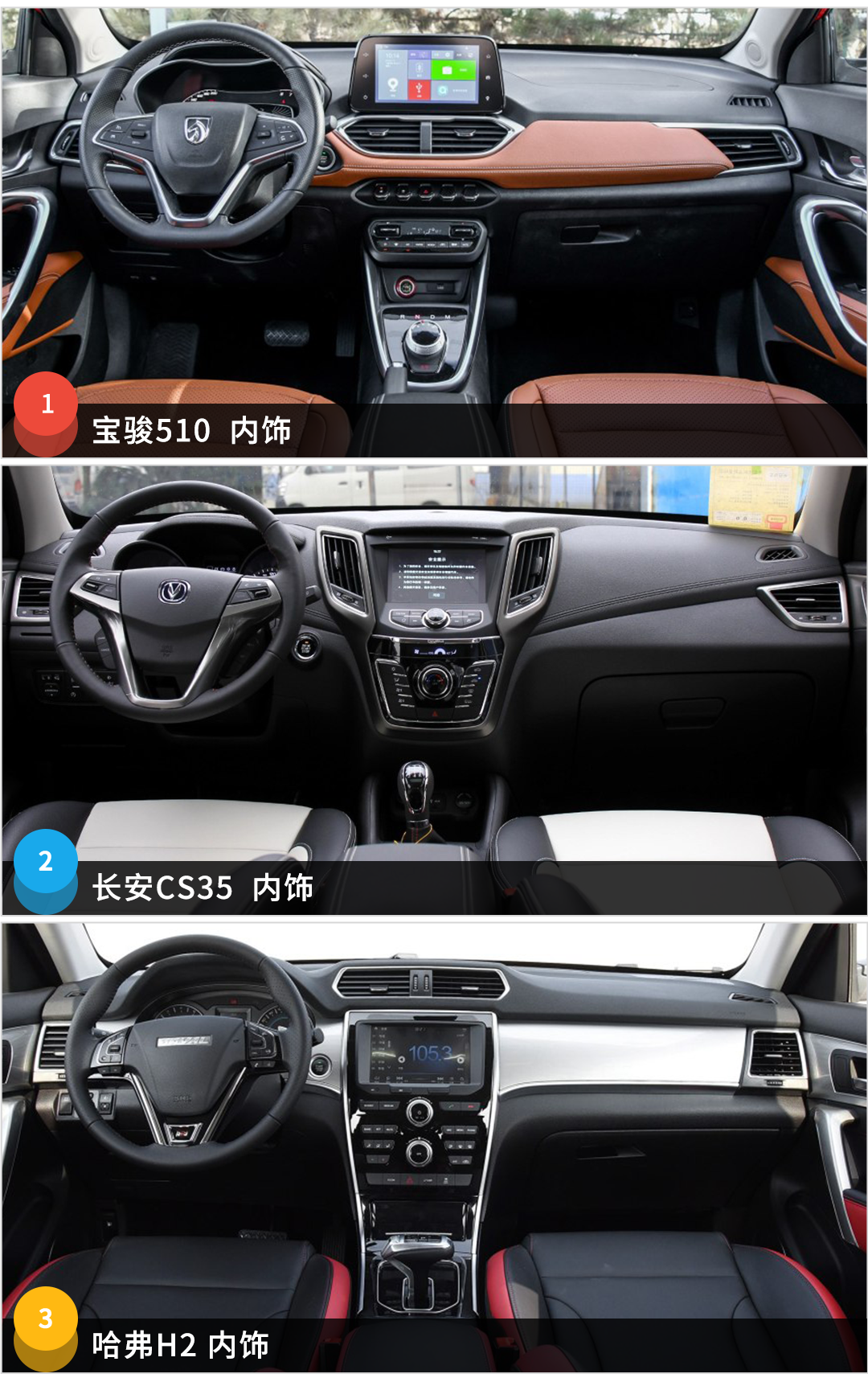 宝骏510内饰设计简洁,悬浮式的中控屏幕增添时尚感,虽然中控台大面积采用硬塑料材质,不过好在做工比较到位;长安CS35的内饰造型中规中矩,用料与做工处于同级正常水准。而哈弗H2在三者中脱颖而出,T字形布局加上装饰面板的点缀,具有较强的层次感,中控台覆盖软质材料,触感与视觉效果都能给人留下良好的印象。