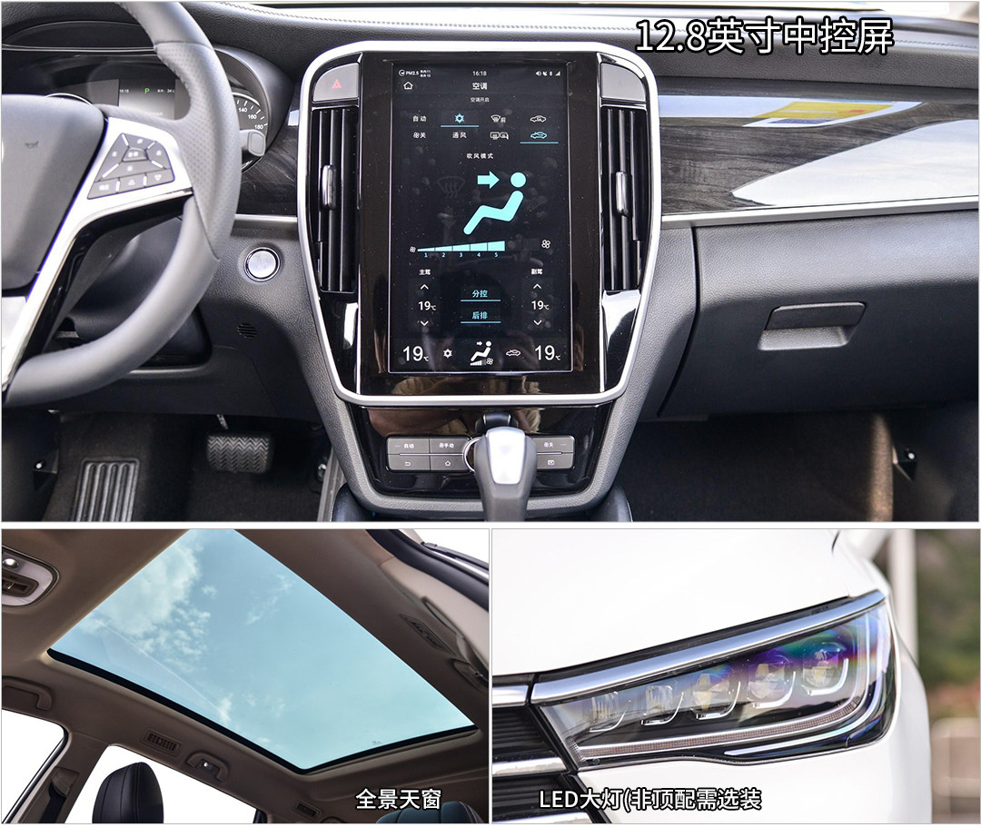 销量较多的是次顶配,价格去到11万了,气囊增至8个,加入胎压监测,还有超巨大的纵置12.8英寸中控屏,手机互联、导航等都具备,另外国人都喜欢的全景天窗、倒车影像、定速巡航等配置都一应俱全,配置满满的诚意是比亚迪的强项,有点不足是LED远近光灯要顶配才有,非顶配要选装。