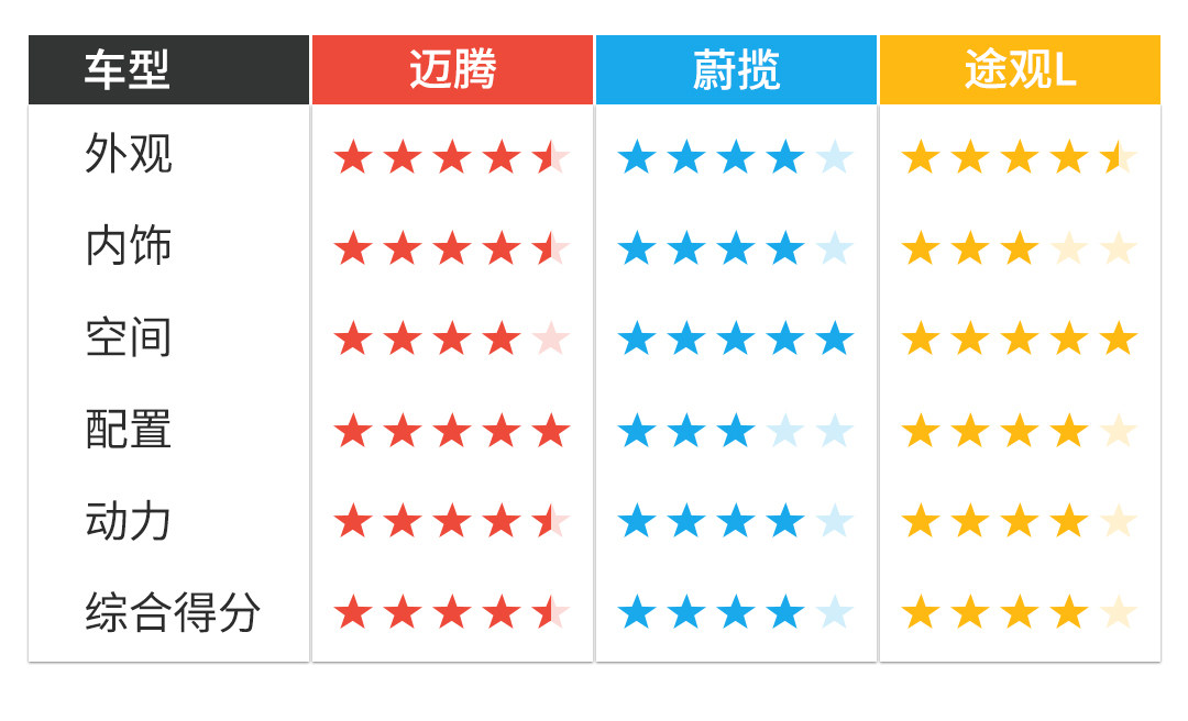 除了空间以外,配置也是体现出“成本花在哪里”的关键因素。所以我们选择了动力和售价(注:都为2.0T发动机,售价指终端优惠后)接近的车型进行对比。首先不考虑配置是否实用,光看配置的豪华程度,迈腾就已经完胜了,而途观L也还不赖,不过由于蔚揽的配置显得很寒酸了,毕竟是进口车型,可能大部分成本都在税收里头吧。
