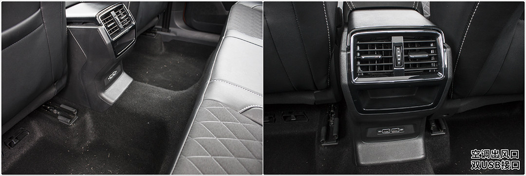 遗憾的是,后排中央地板隆起较高,幸亏纵向长度足以安放一般成年男子的鞋子,后排空调出风口和双USB接口的加入还算功过相抵。