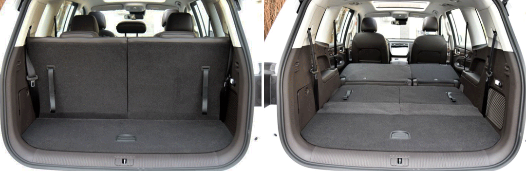 后备厢尺寸很大,并且第二排、第三排放倒后能组合成纯平的储物空间,在车内乘坐7名乘客的情况下,后备厢仍能放下两个登机箱,实用性不成问题!而把座椅都放倒后,储物空间也相当规整。