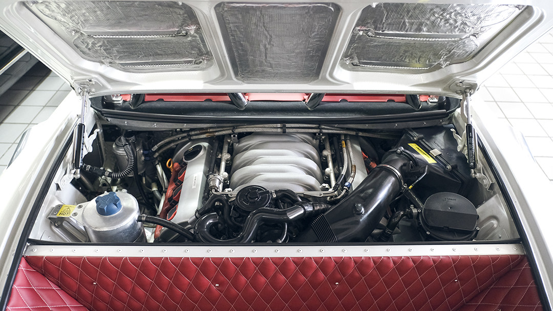 开启引擎盖,竟然发现一个尺寸不小的由真皮包裹的尾箱,看来作为一台中置后驱的高性能跑车,C8 Spyder的储物性能甚至比大部分欧洲大牌更胜一筹啊!而世爵之所以能够在尾部挤出这么大一个尾箱空间,就是因为它采用了一台体积较小的奥迪4.2公升自然吸气V8发动机。在C8系列中,共搭载了400马力和620马力两种版本的V8发动机,而这台C8 Spyder搭载的正是400马力的低功率版本发动机。