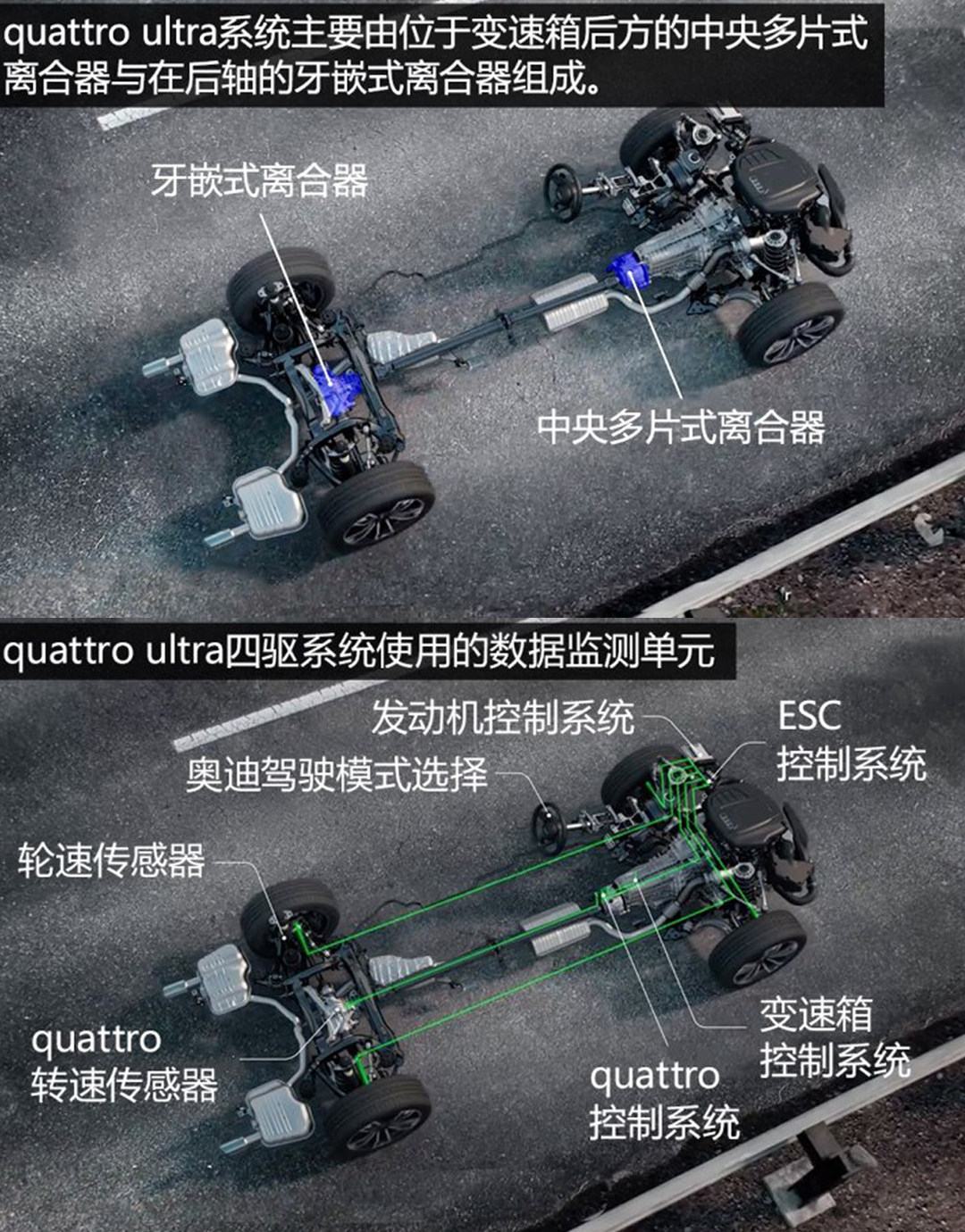 Quatrro Ultra系统主要由位于变速箱后方的中央多片式离合器与在后轴的牙嵌式离合器所组成。Quatrro Ultra系统的中央多片式离合器所起到的作用其实和Haldex四驱系统是一样的,都是通过调节多片式离合器的压紧程度来调节往后轴输送的扭矩,唯一的不同点在于Quatrro Ultra是通过电控来调节压紧程度。