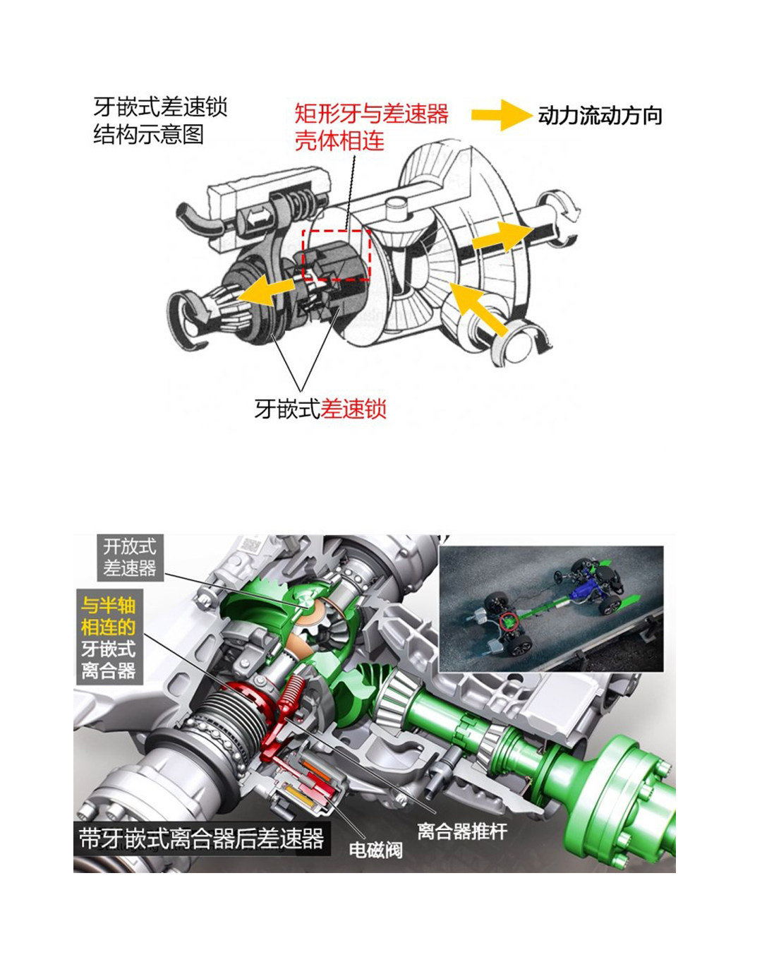 Quatrro Ultra后轴牙嵌式离合器设置在右半轴上,看起来像是个牙嵌式的差速锁,其实并不是,因为在结构上牙嵌式差速锁作为媒介将半轴与后差速器壳体连为一体了,这是一条硬连接的轴。至于作用主要用于控制后轴与中央传动轴之间的动力通断,在处于两驱之时,将中央多片离合器和后半轴上的牙嵌式离合器断开,中央传动轴和后差速器壳会同时停止运动,此时后轮将只带动后半轴和齿轮转动,减少车辆行驶时所需要带动的部件,进而来控制减少能量的多余消耗。