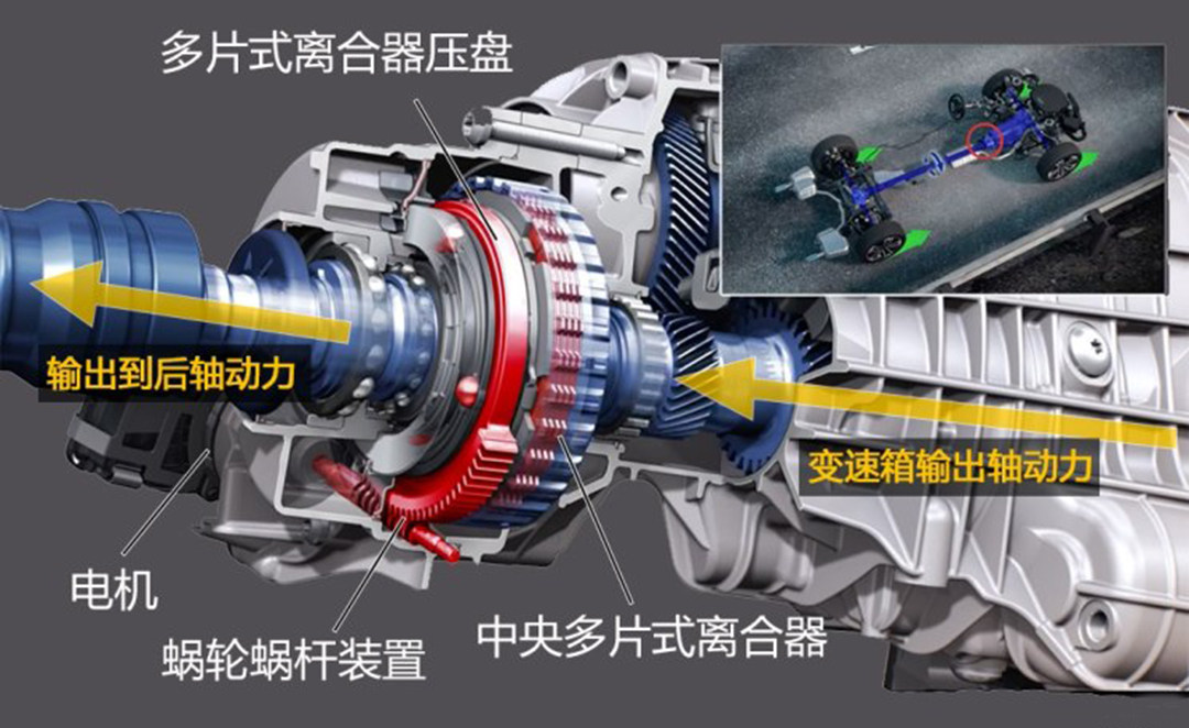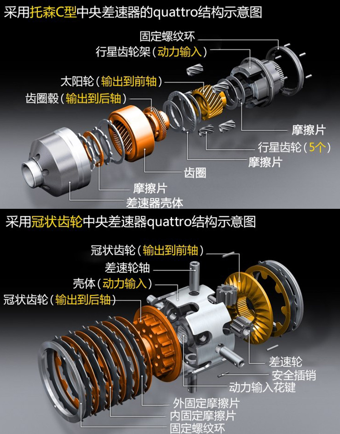 旧Quattro系统其实就是一套机械控制的四驱系统,采用的是不需要电子系统控制的扭矩感应式纯机械中央差速器,其中纯机械式中央差速器的摩檫片主要用于限滑,在正常传递动力之时不起作用。